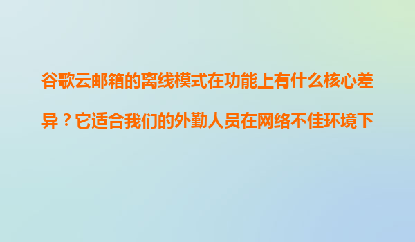 2025-11-09谷歌云郵箱離線模式的核心功能差異與外勤人員適用性分析 一、谷歌云郵箱離線模式的三大核心功能差異 1.1郵件本地化存儲(chǔ)與管理 與常規(guī)在線模式相比,離線模式會(huì)將最近郵件(默認(rèn)30天內(nèi))緩存至本地瀏覽器存...