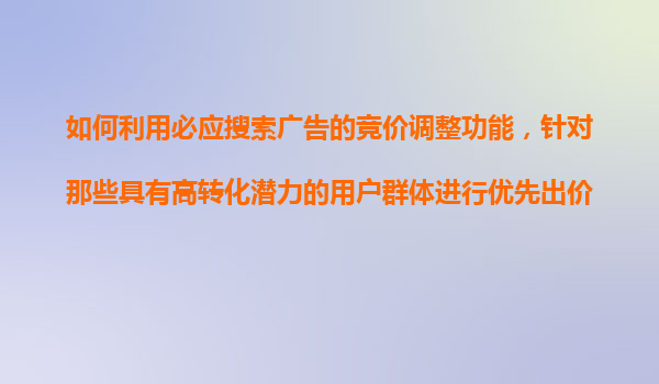 2025-11-08必應(yīng)搜索引擎競價(jià)推廣的核心優(yōu)勢與標(biāo)題策略分析 一、精準(zhǔn)流量獲取,鎖定高價(jià)值用戶群體 必應(yīng)作為全球第二大搜索引擎,擁有超過5億的月活用戶,尤其在企業(yè)級用戶和高收入人群中占據(jù)顯著優(yōu)勢。通過必應(yīng)競價(jià)推廣(...