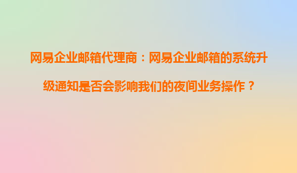 4008-020-360 網(wǎng)易企業(yè)郵箱代理商:網(wǎng)易企業(yè)郵箱的系統(tǒng)升級通知是否會影響我們的夜間業(yè)務(wù)操作? 網(wǎng)易企業(yè)郵箱作為國內(nèi)領(lǐng)先的企業(yè)通信解決方案提供商,一直致力于為企業(yè)用戶提供穩(wěn)定、安全、高效的企業(yè)郵箱服務(wù)。近...