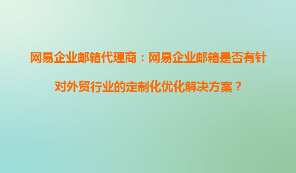 2025-10-20網(wǎng)易企業(yè)郵箱代理商:網(wǎng)易企業(yè)郵箱是否有針對外貿(mào)行業(yè)的定制化優(yōu)化解決方案? 在全球化的商業(yè)環(huán)境中,外貿(mào)行業(yè)對高效、安全且穩(wěn)定的通信工具有著極高的需求。網(wǎng)易企業(yè)郵箱作為國內(nèi)領先的企業(yè)郵箱服務提供商...